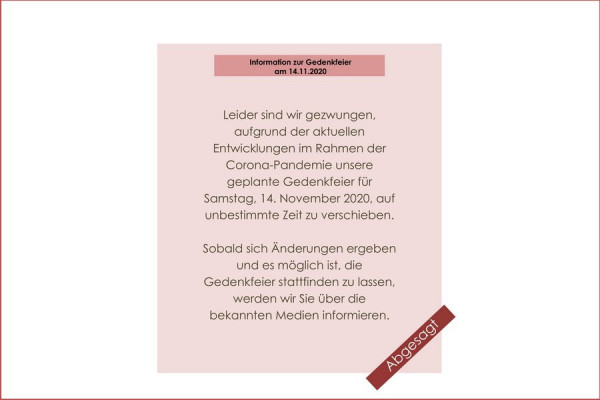 Aufgrund der aktuellen Entwicklungen im Rahmen der Corona-Pandemie, müssen wir leider den geplanten Gedenkabend auf unbestimmte Zeit verschieben.